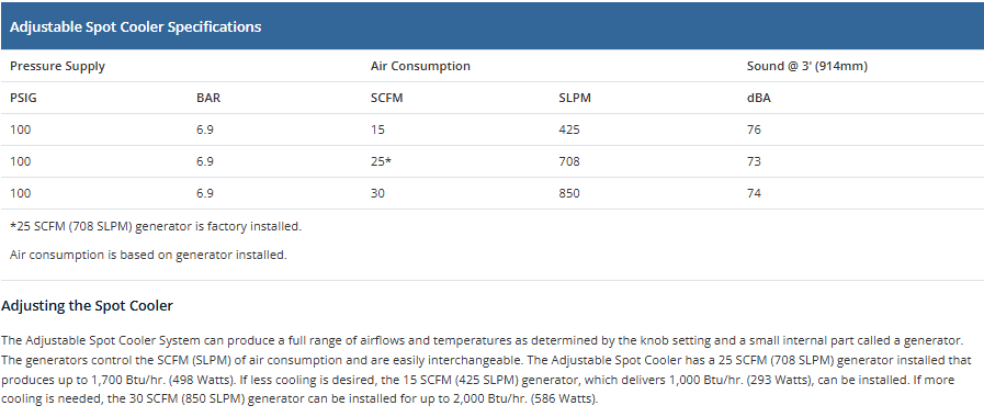 Model 3925 Adjustable Spot Cooler System includes the Adjustable Spot Cooler, dual point hose kit with cone and fan nozzles, swivel magnetic base, filter separator, 15 and 30 SCFM (425 and 850 SLPM) generators. (25 SCFM/708 SLPM generator installed.) (Adjustable Spot Cooler with dual point hose kit is recommended when heat is generated over a larger surface area.)